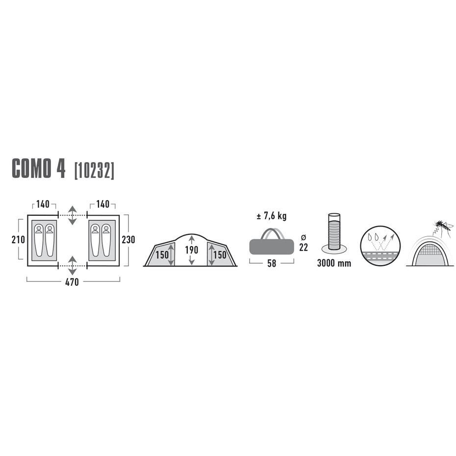 2-sypialniany namiot rodzinny COMO wykonany został z wysokiej jakości materiału o wysokiej wodoodporności, z klejonymi szwami. Dwupowłokowa konstrukcja pozwala na odizolowanie sypialni od konstrukcji zewnętrznej namiotu. Przepływ powietrza pomiędzy ściankami sypialni a tropikiem zapobiega wyziębianiu sypialni. Otwory wentylacyjne. Stelaż z włókna szklanego jest trwały i bardzo szybki w rozkładaniu i składaniu. Możliwość rozstawienia daszku z wykorzystaniem tropiku z wejścia namiotu.