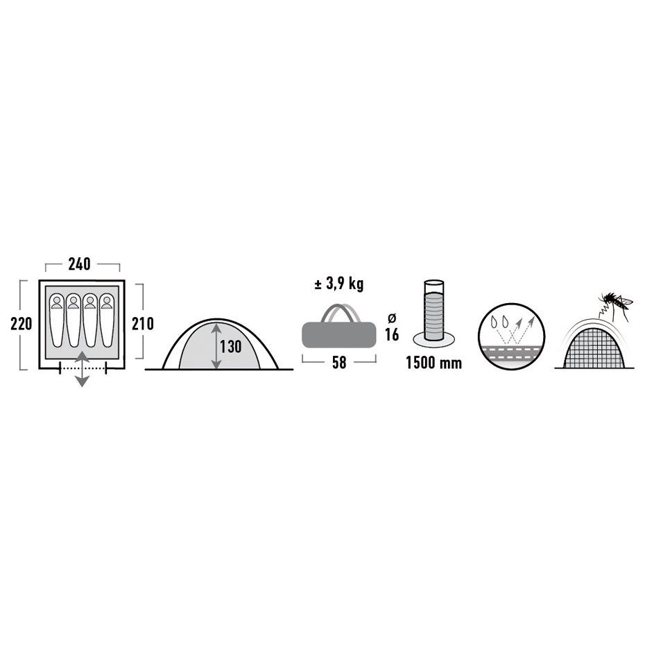 Dwupowłokowy, czteroosobowy namiot biwakowy typu igloo z zadaszonym wejściem. Niewielkie wymiary i waga sprawiają, że jest łatwy do rozłożenia i złożenia.