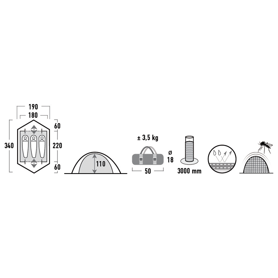 • Wymiary po rozłożeniu: 180 x 220 ( + 85 cm przedsionek )