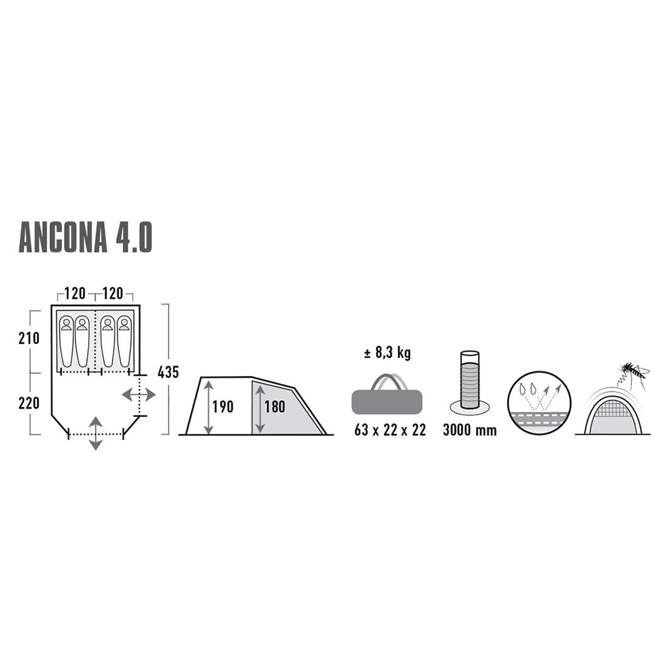 Duży namiot z dwiema sypialniami i dwoma wejściami – przednim i bocznym. Otwory wentylacyjne. Przestronny przedsionek. Wejście wyposażone jest w moskitierę. Szwy laminowane i wodoodporność 3000mm gwarantują bardzo dobrą ochronę przed deszczem.