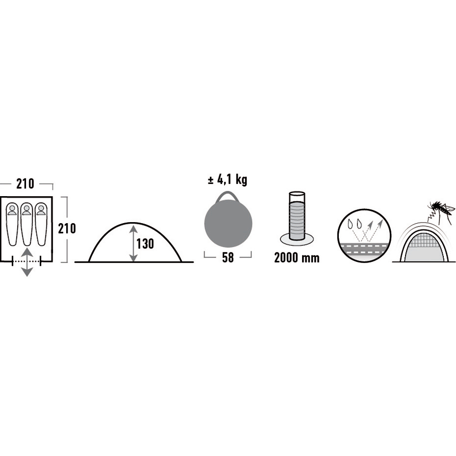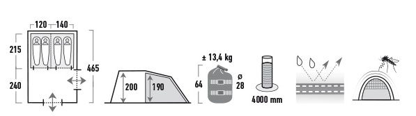 Duży, przestronny, rodzinny namiot, wykonany z najwyższej jakości materiałów, które wykazują się dużą wytrzymałością oraz wysokim stopniem wodoodporności, dodatkową ochroną przed wilgocią, wodą oraz wiatrem są podklejane szwy. Dwie oddzielne sypialnie, pozwolą na komfortowy wypoczynek. Dwu wejściowy przedsionek, pozwoli na cyrkulację powietrza oraz dzięki swojej wysokości, może dodatkowo służyć jako pomieszczenie gospodarcze, czy jadalnie. Dzięki oknom z kurtynom w przedsionku, w bardzo prosty sposób mamy możliwości wpuścić trochę światła do namiotu.