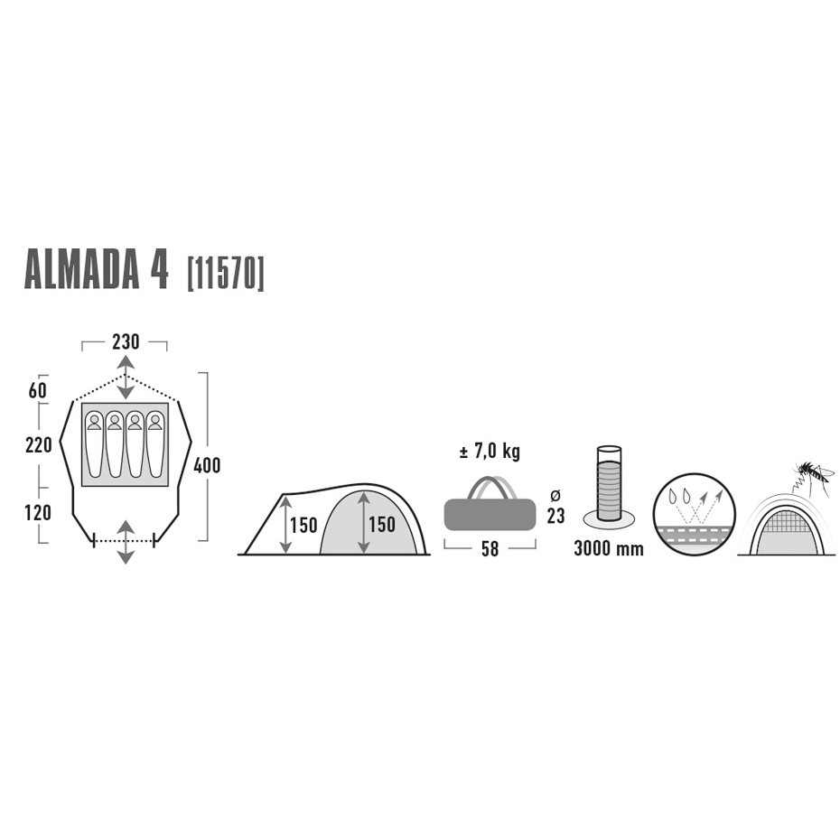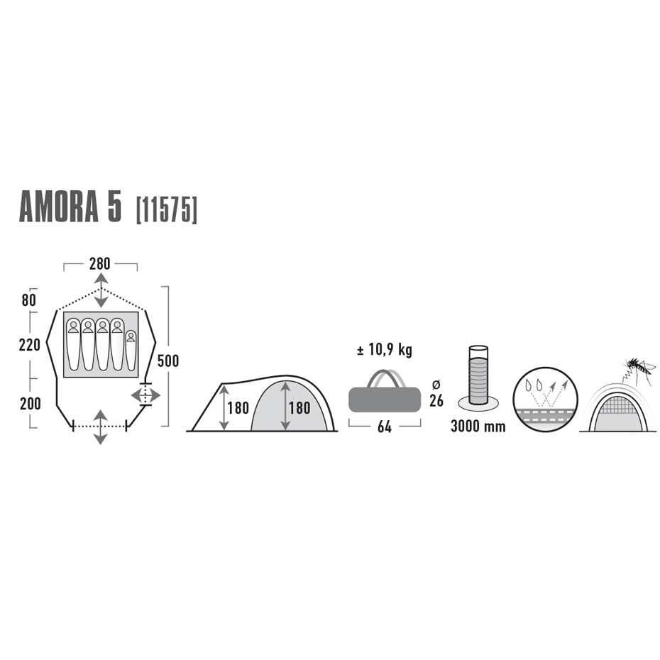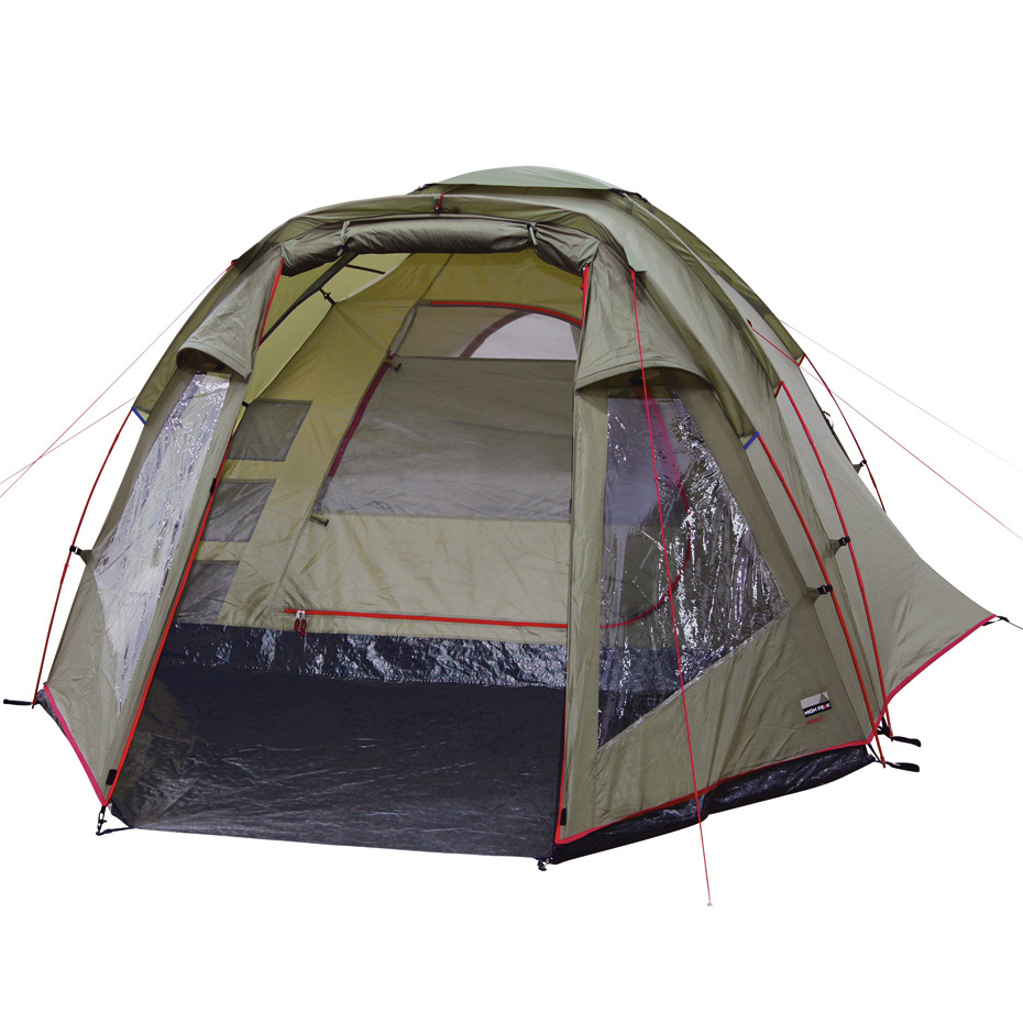 Rodzinny namiot z dwoma wejściami – przednim i bocznym. Otwory wentylacyjne. Przestronny przedsionek, może być wykorzystany jako kuchnia czy pomieszczenie gospodarcze. Wejście wyposażone jest w moskitierę. Szwy laminowane i wodoodporność 3000mm. Dwupowłokowy w części sypialnianej.
