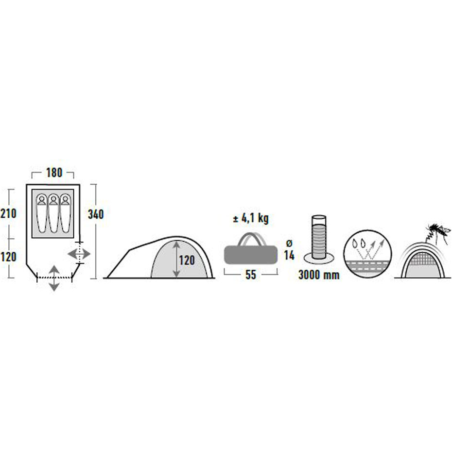 Namiot dla 5 osób Kira od firmy High Peak wyposażony został w dwa wejścia – przednie i boczne. Otwory wentylacyjne. Przestronny przedsionek sprawdzi się jako kuchnia czy pomieszczenie gospodarcze. Wejście wyposażone jest w moskitierę. Szwy laminowane i wodoodporność 3000 mm gwarantują bardzo dobrą ochronę przed deszczem. Dwupowłokowy.
