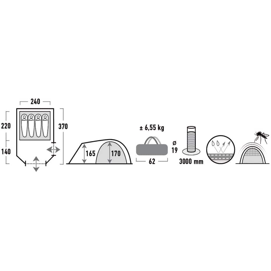 Rodzinny namiot czteroosobowy z dwoma wejściami. Otwory wentylacyjne gwarantuje ciągły ruch powietrza oraz przyjemny klimat. Przedsionek możemy zagospodarować jako kuchnię lub pomieszczenie gospodarcze. Wejście zostało zaopatrzone w moskitierę która chroni przed owadami. Zalaminowane szwy podnoszą ochronę przed deszczem i wiatrem.